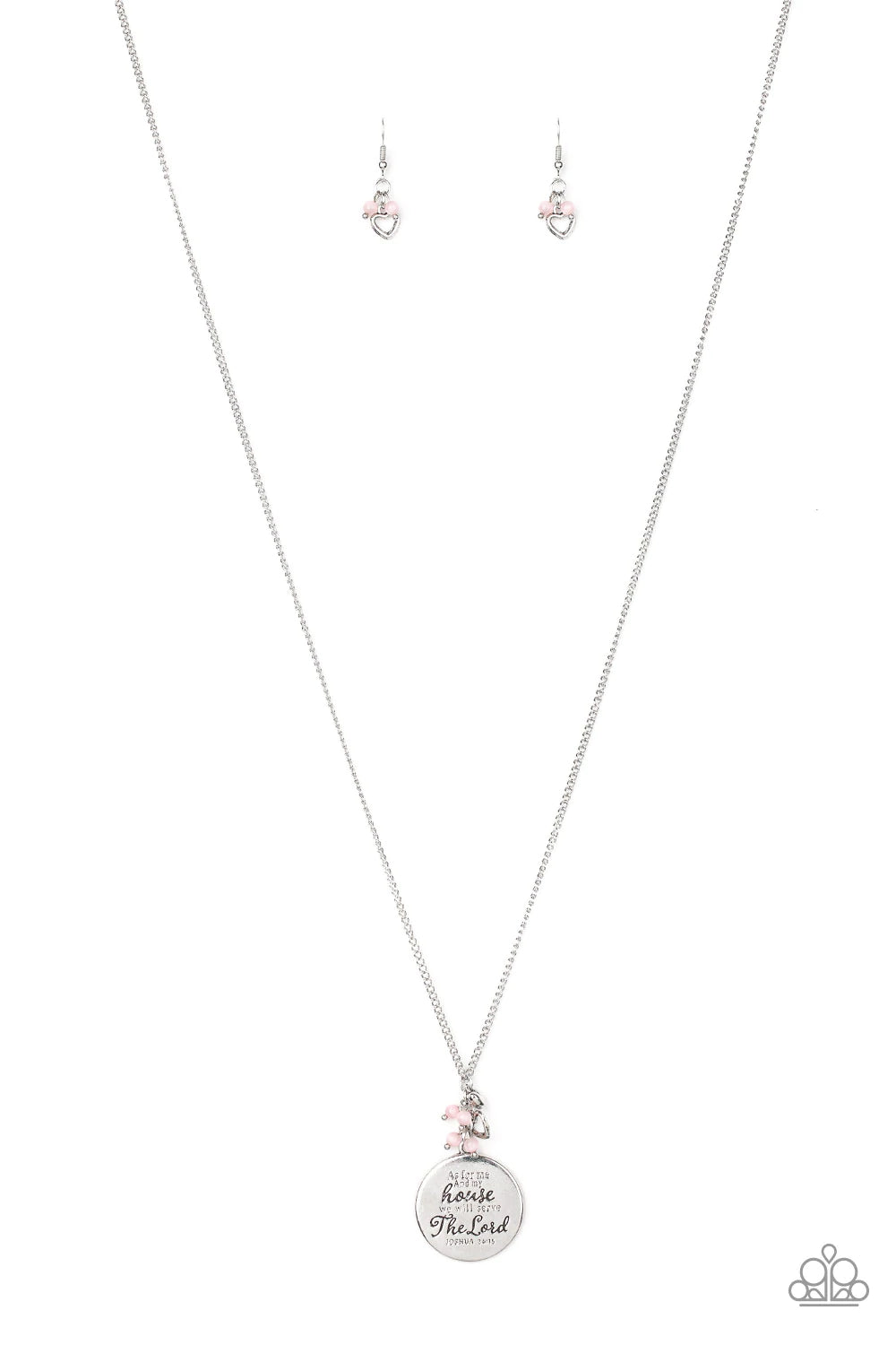Infused with a lengthened silver chain, dainty silver heart charm, and glassy pink beads, a silver disc is stamped in the inspirational phrase, "As for me and my house/we will serve the lord, Joshua 24:15". Features an adjustable clasp closure.