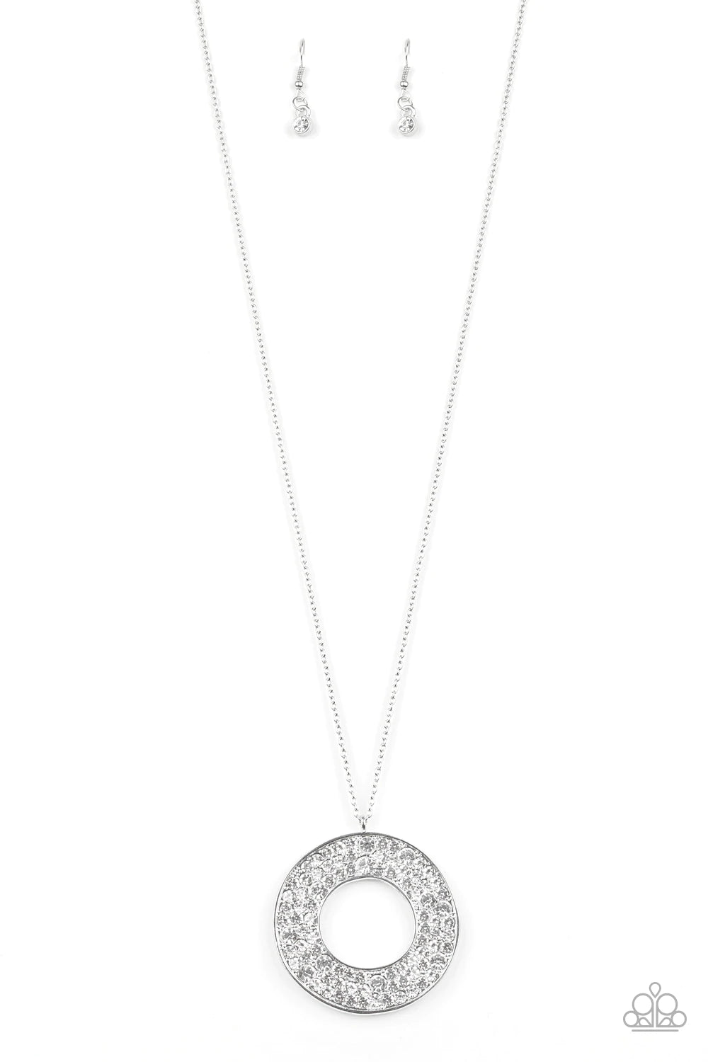 Encrusted in row after row of glittery white rhinestones, an oversized round pendant swings from the bottom of a lengthened silver chain for a blinding look. Features an adjustable clasp closure.