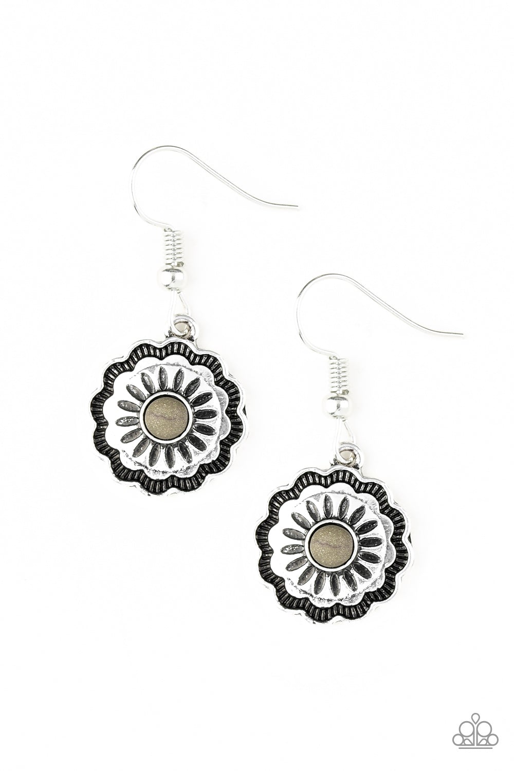 A green stone is pressed into a shimmery silver floral frame radiating with antiqued textures for a seasonal flair. Earring attaches to a standard fishhook fitting.
