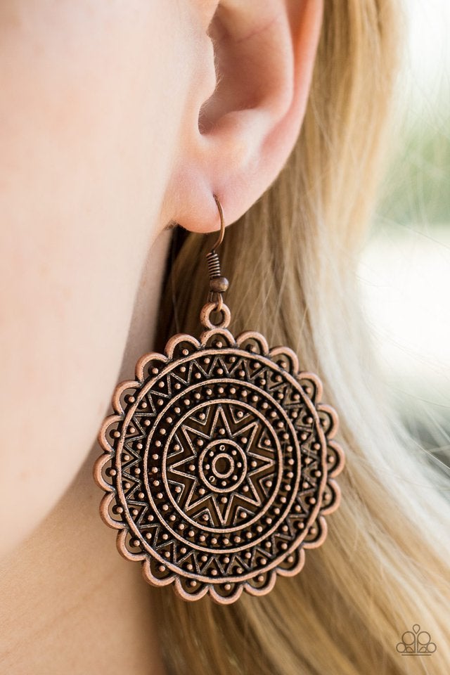 Dotted in dainty copper studs, a round copper frame radiates with a brilliant sunburst pattern for a tribal inspired look. Earring attaches to a standard fishhook fitting.