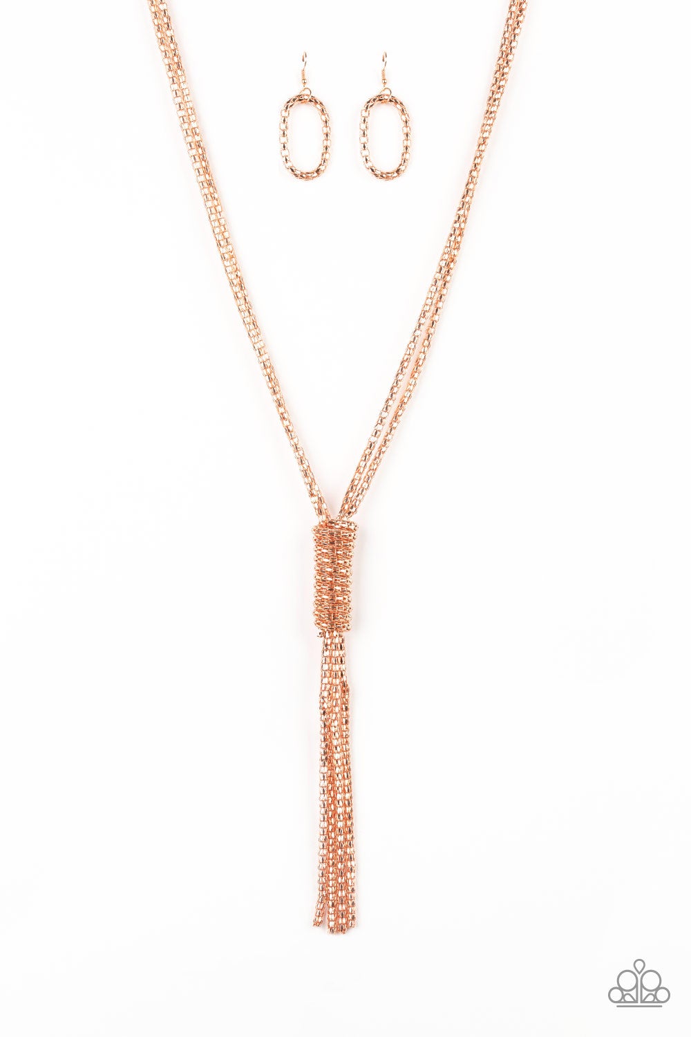 Shimmery strands of shiny copper popcorn chain dramatically fall down the chest. An additional chain wraps around the cascading strands, creating a bold central pendant with shimmering tassels.