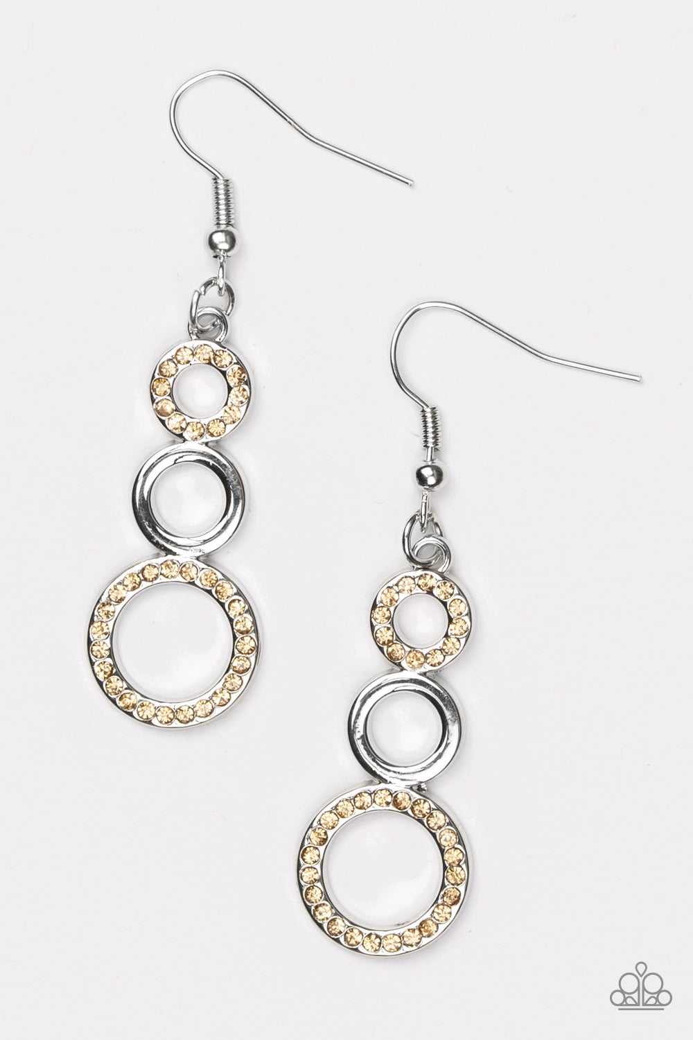 Alternating in golden topaz rhinestones, shiny silver circles gradually increase in size as they connect into a bubbly lure. Earring attaches to a standard fishhook fitting.