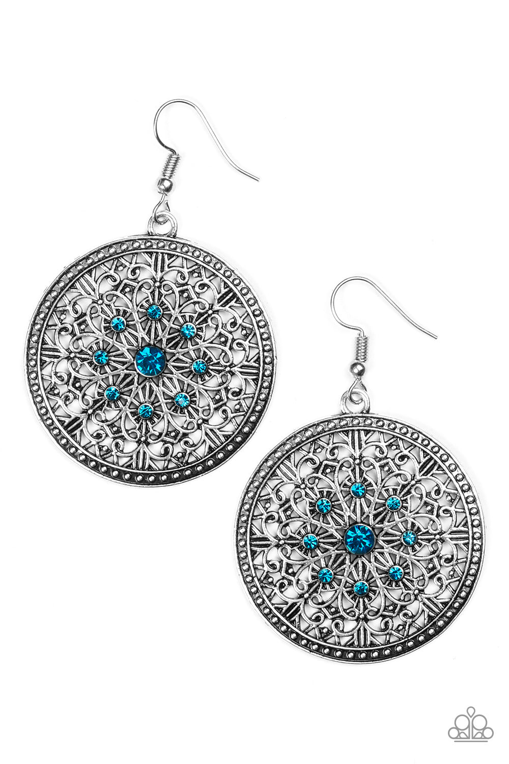 Shimmery silver filigree swirls into an ornate snowflake pattern. Glittery blue rhinestones are pressed into the ornate center for a regal finish. Earring attaches to a standard fishhook fitting.