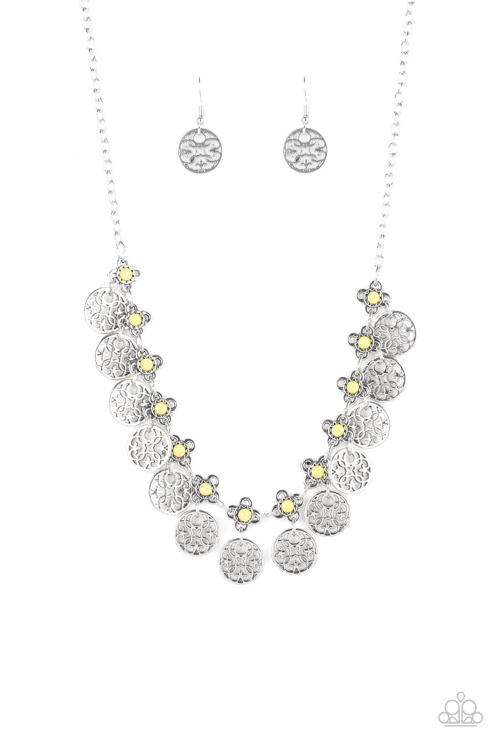 Silver mandala-like frames swing from the bottom of yellow beaded fittings, creating a flirtatious fringe below the collar. Features an adjustable clasp closure.