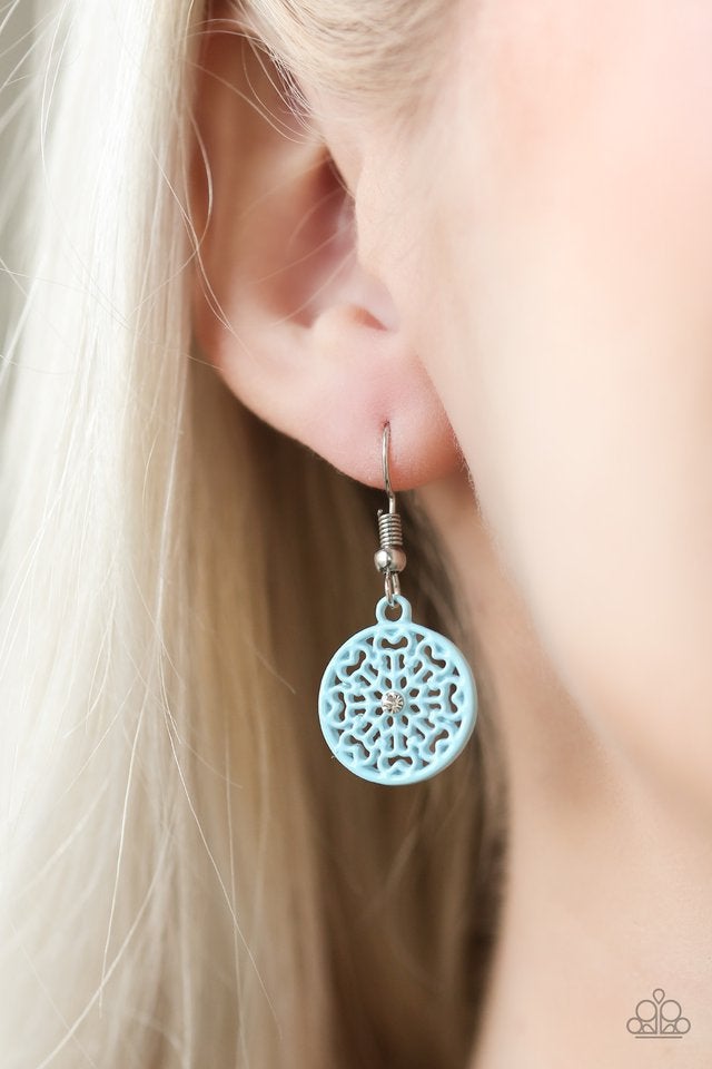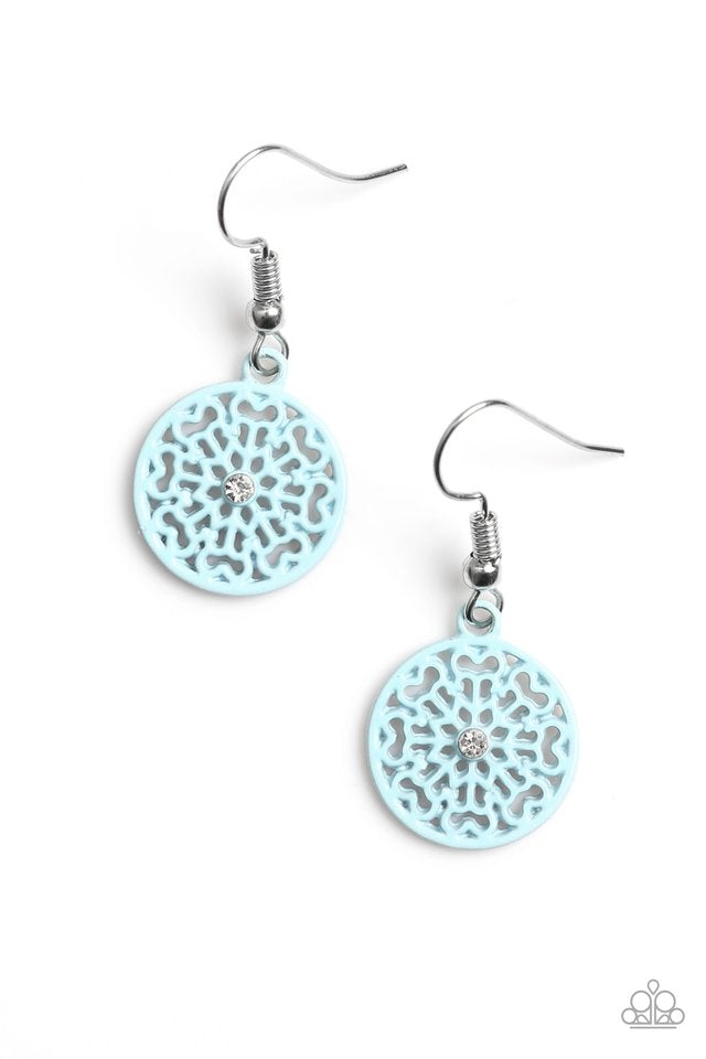 Brushed in a refreshing blue finish, an ornate frame swings from the ear for a whimsical fashion. A dainty white rhinestone is pressed into the center of the frame for a feminine finish. Earring attaches to a standard fishhook fitting.
