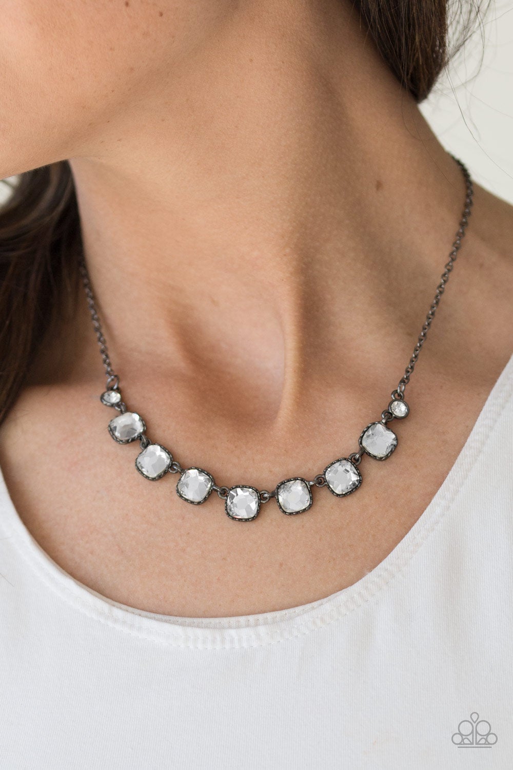Infused with textured gunmetal frames, glassy white gems delicately link below the collar for a timeless look. Features an adjustable clasp closure.