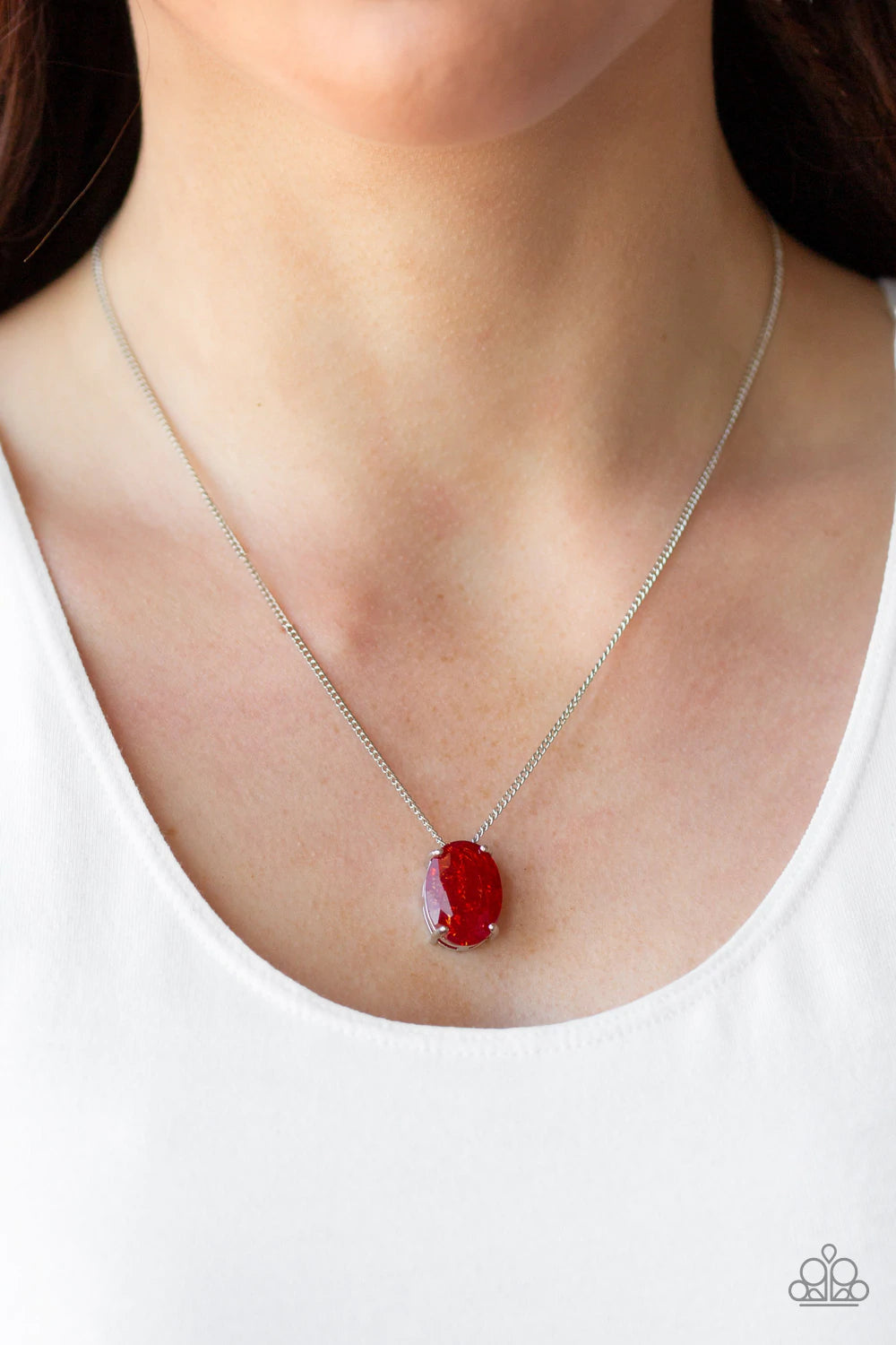 Featuring an icy crackle, a glassy red gem is nestled inside of a classic silver fitting, creating a dazzling pendant below the collar. Features an adjustable clasp closure.