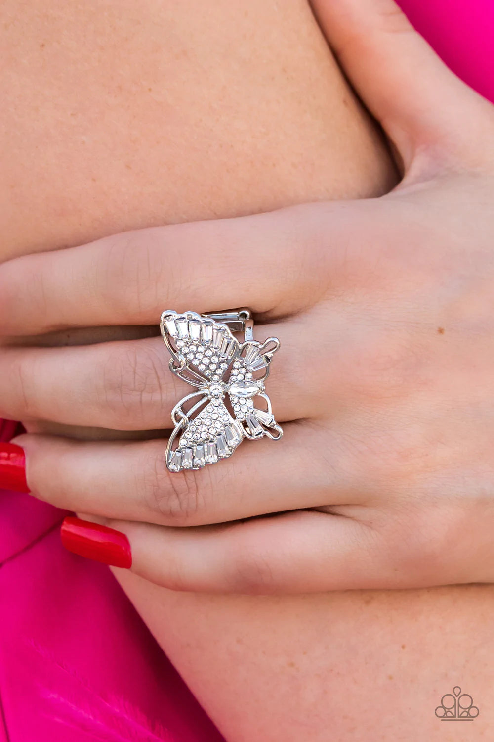 Sparkling with round, teardrop, and emerald cut white rhinestones, a silver butterfly fearlessly flutters atop the finger for a statement-making finish. Features a stretchy band for a flexible fit.