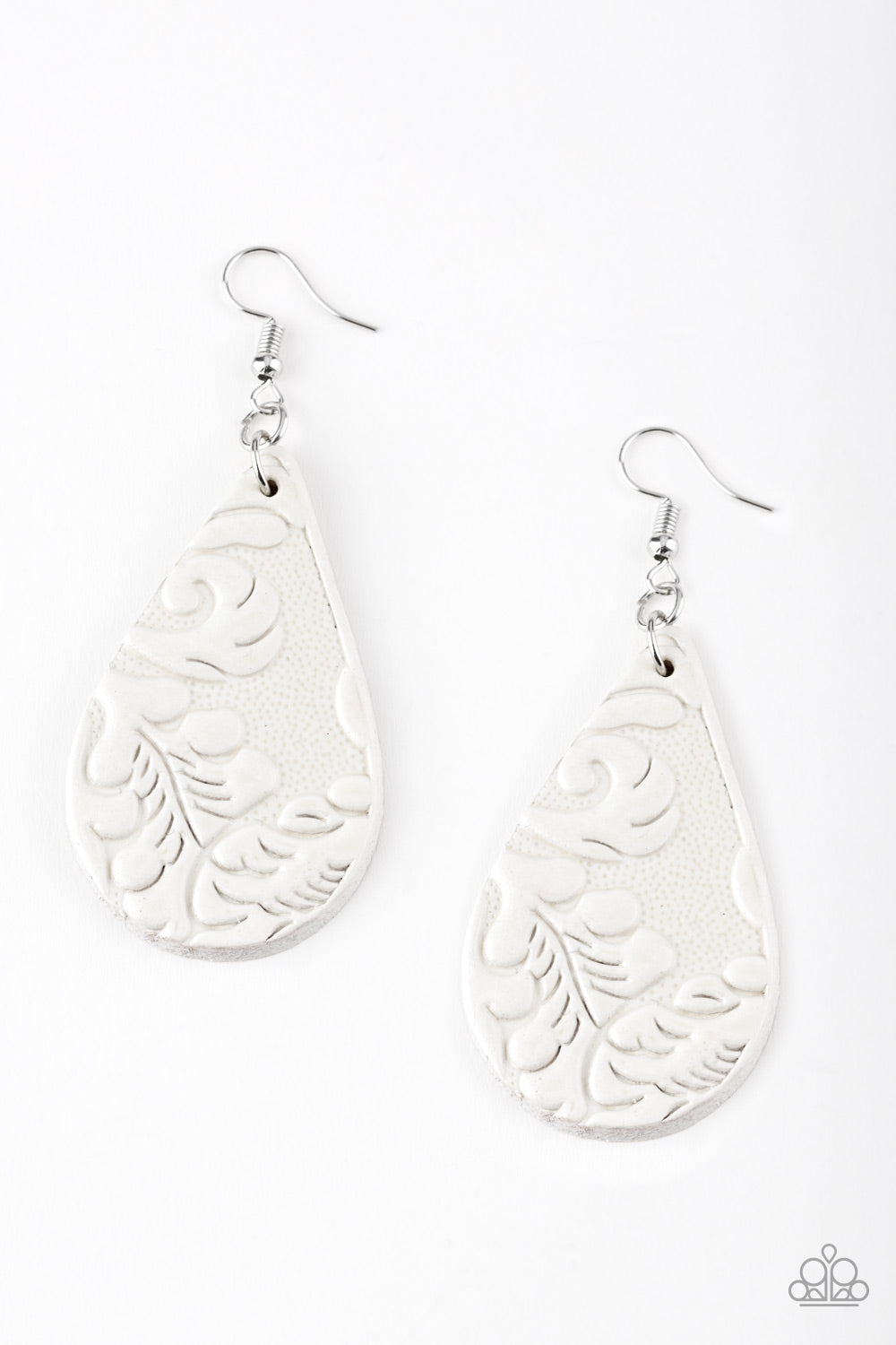 Stamped in a feathery, paisley like pattern, an earthy white leather teardrop swings from the ear for a seasonal look. Earring attaches to a standard fishhook fitting.