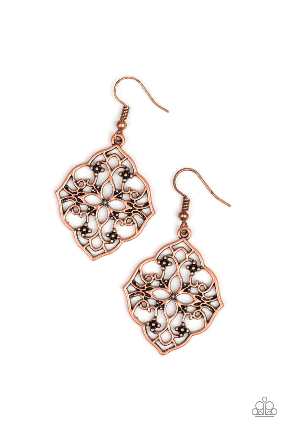 Brushed in an antiqued shimmer, glistening copper filigree swirls into a whimsical floral frame for a seasonal look. Earring attaches to standard fishhook fitting.