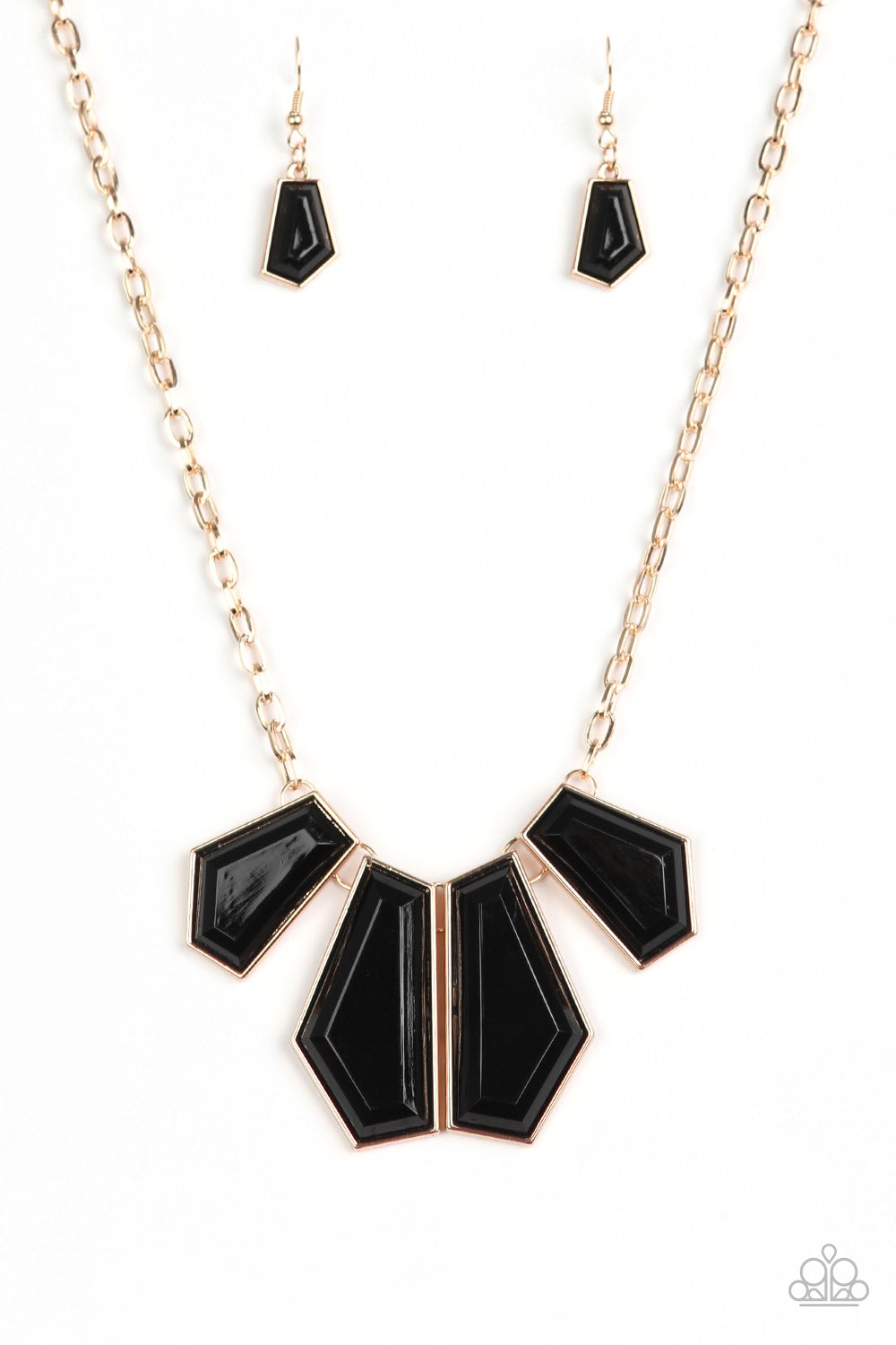 Featuring emerald-style cuts, faceted black beads are pressed into sleek gold frames. The colorful frames join at the bottom of a shimmery gold chain, creating a bold geometric fringe below the collar. Features an adjustable clasp closure.