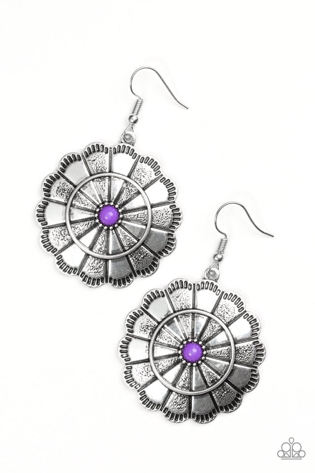 Shimmery silver petals bloom from a vivacious purple center for a seasonal look. Etched in serrated edges, alternating petals have been delicately hammered in texture, adding depth and shimmer to the whimsical frame. Earring attaches to a standard fishhook fitting.