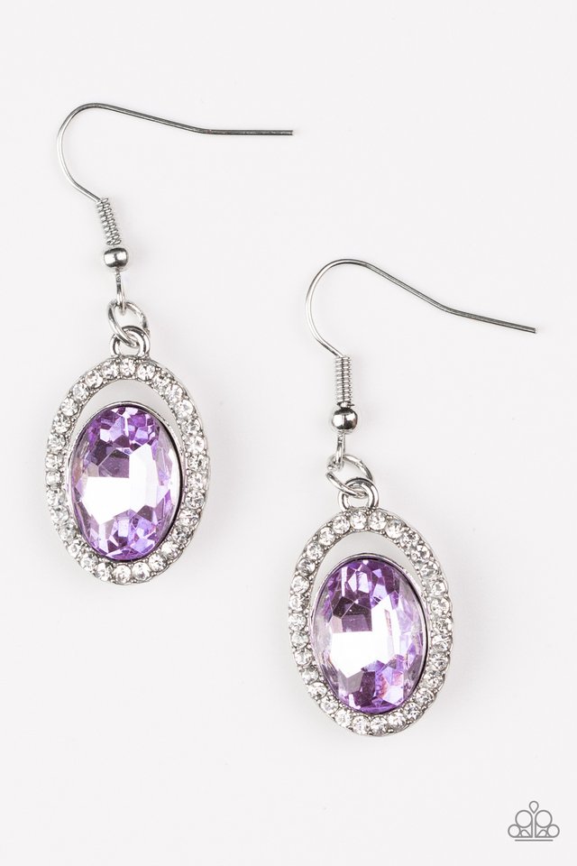 A glittery purple gem sits slightly off-center inside a shimmery silver frame encrusted in glassy white rhinestones. Earring attaches to a standard fishhook fitting.