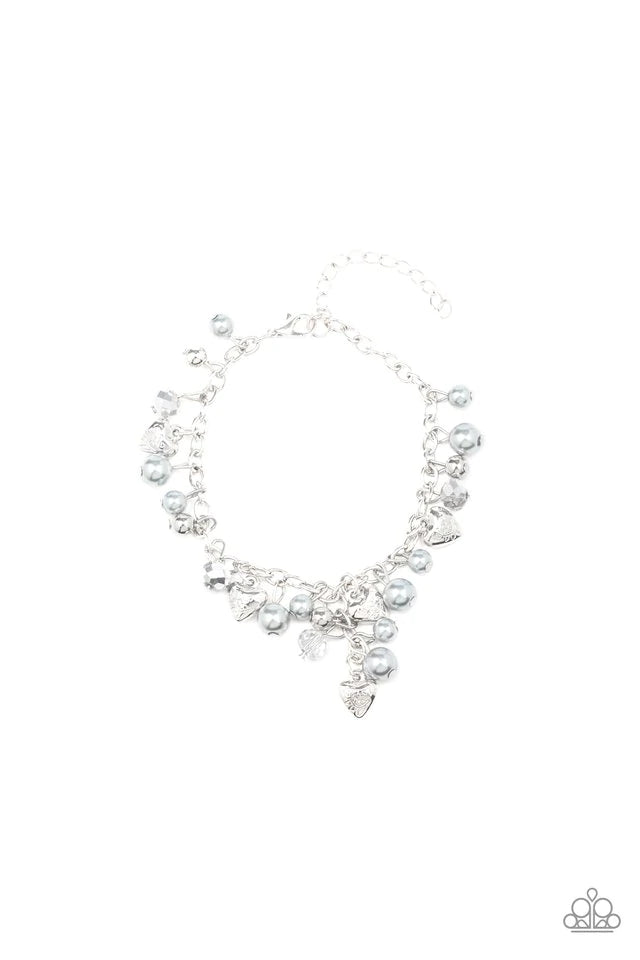 A refined collection of silver beads, silver pearls, and smoky crystal-like beads cluster around the wrist, creating a timeless fringe.