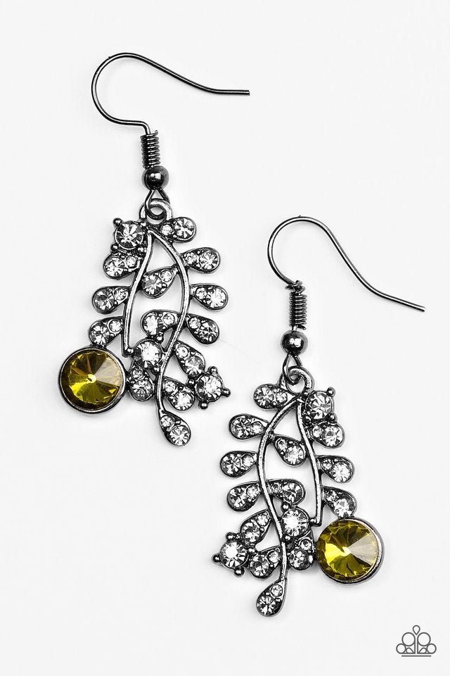 Encrusted in smoky rhinestones, shimmery gunmetal vines drip from the ear for a seasonal look. The shimmery foliage gives way to a large green rhinestone for a refined finish. Earring attaches to a standard fishhook fitting.