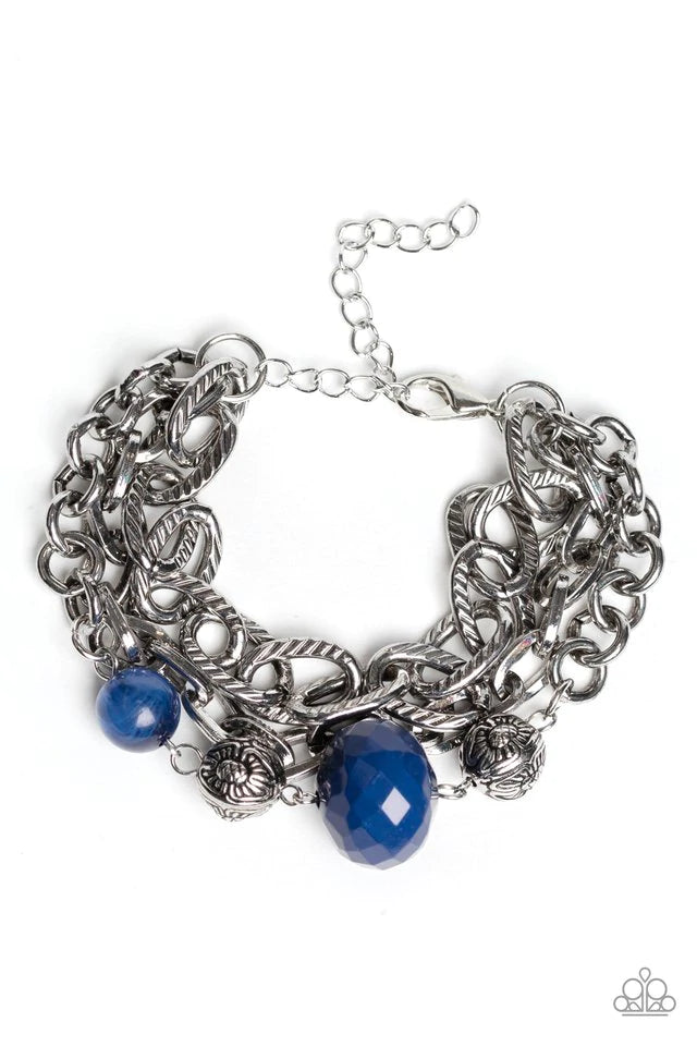Three exaggerated rows of mismatched antiqued silver chains layer across the wrist. Infused with floral silver beads, faceted and opaque Evening Blue beads adorn one strand for a bold pop of color. Features an adjustable clasp closure.