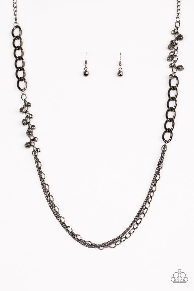 Sections of bold gunmetal chain and faceted gunmetal beads give way to mismatched gunmetal chains, layering down the chest in a bold industrial fashion. Features an adjustable clasp closure.