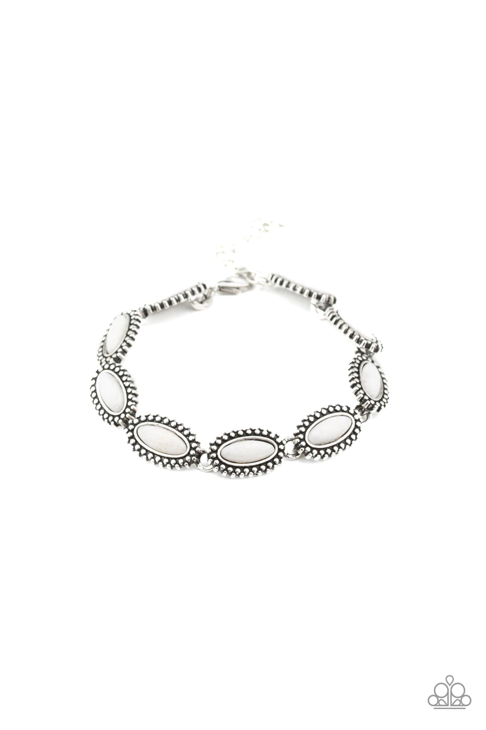 Featuring glassy white stone centers, dainty silver frames link around the wrist for a seasonal look. Features an adjustable clasp closure.