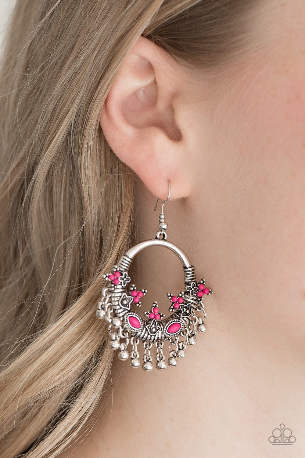 Dainty pink beads are sprinkled along ornate frames that have been pressed into the bottom of a textured silver hoop. Imperfect silver beads swing from the bottom of the seasonal frame, creating a whimsical fringe. Earring attaches to a standard fishhook fitting.