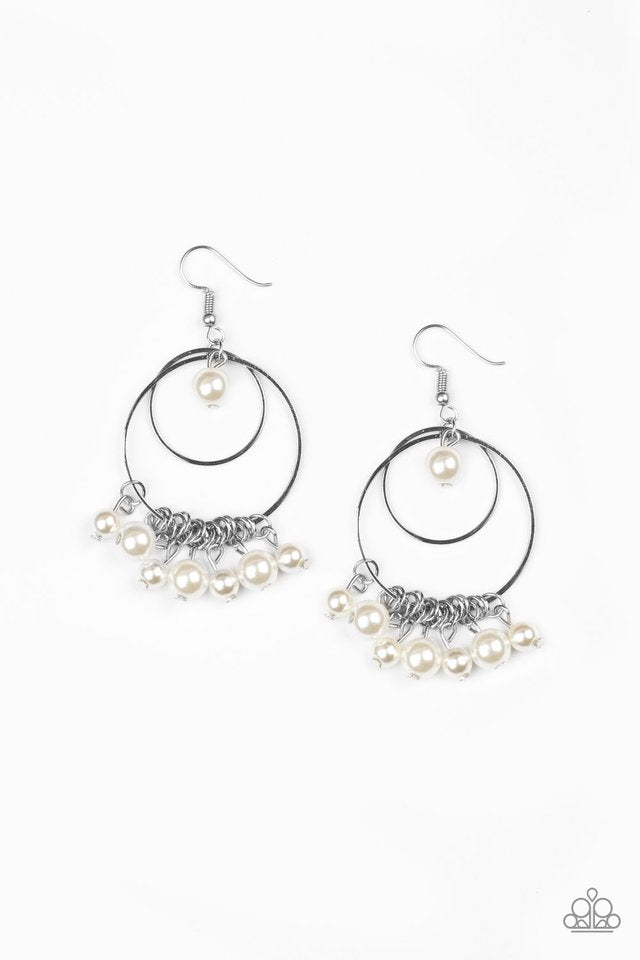 Infused with a bubbly pearl fringe, a double hoop frame swings from the ear. A solitaire pearl swings from the top of the joined hoops for a refined finish. Earring attaches to a standard fishhook fitting.