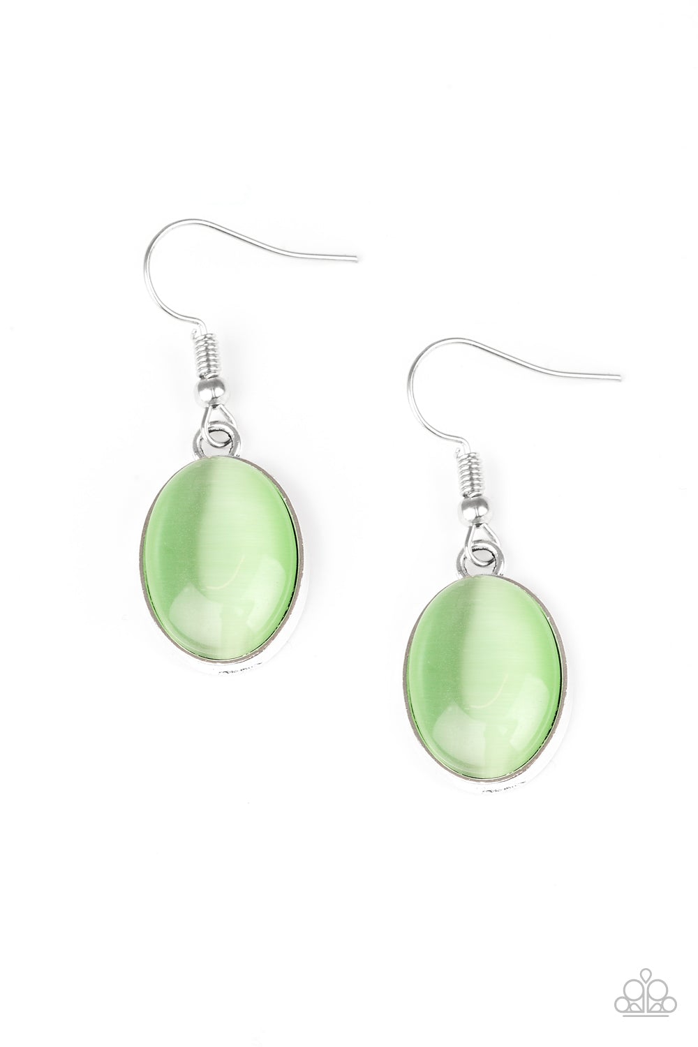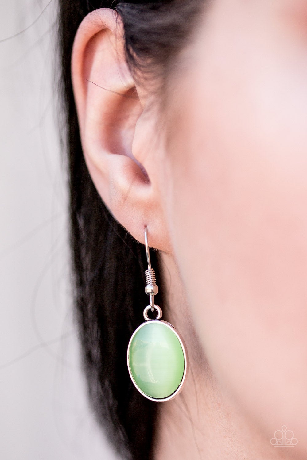 A cool green moonstone is nestled inside a sleek silver frame for a whimsical fashion. Earring attaches to a standard fishhook fitting.