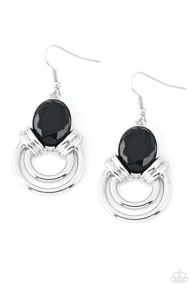 Shimmery silver hoops radiate from the bottom of a dramatic black gem fitting, coalescing into a regal frame. Earring attaches to a standard fishhook fitting.