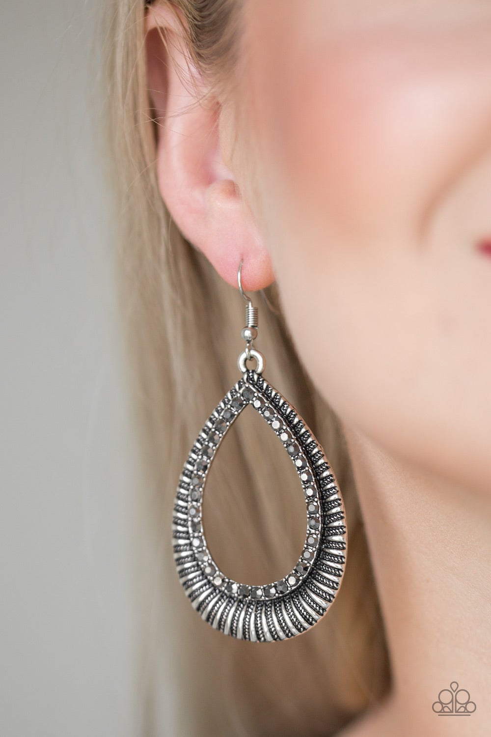 Glittery hematite rhinestones spin around the center of an antiqued silver teardrop radiating with shimmery textures for an edgy look. Earring attaches to a standard fishhook fitting.