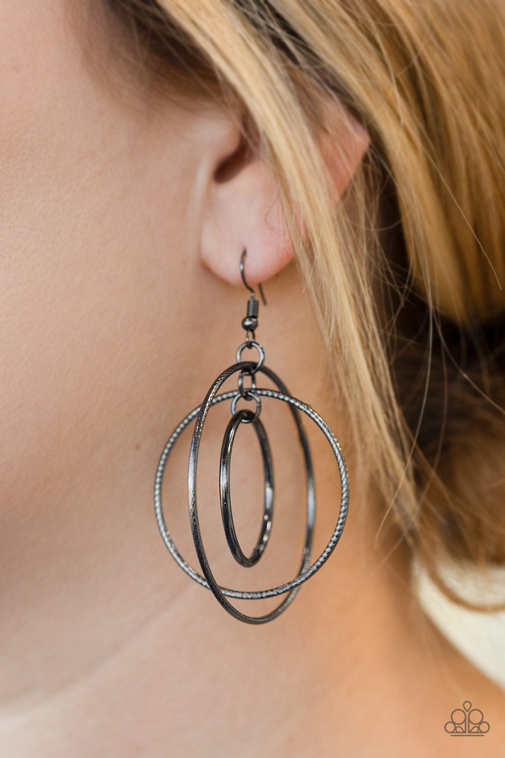 Smooth and serrated gunmetal hoops trickle from the ear, linking into a dizzying lure. Earring attaches to a standard fishhook fitting.