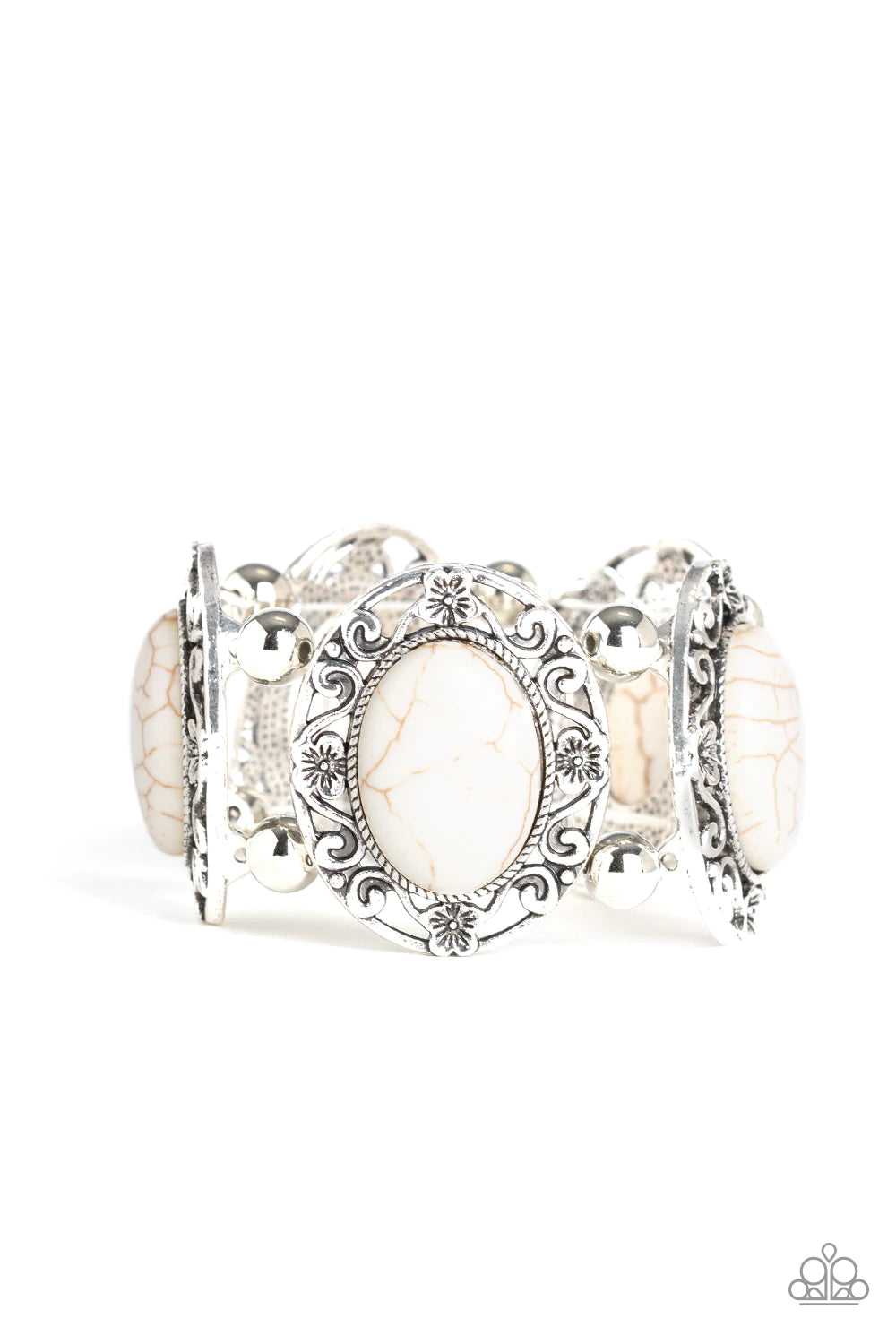 Featuring refreshing white stone centers, a collection of shimmery silver floral frames are threaded along a stretchy band around the wrist for a seasonal flair.