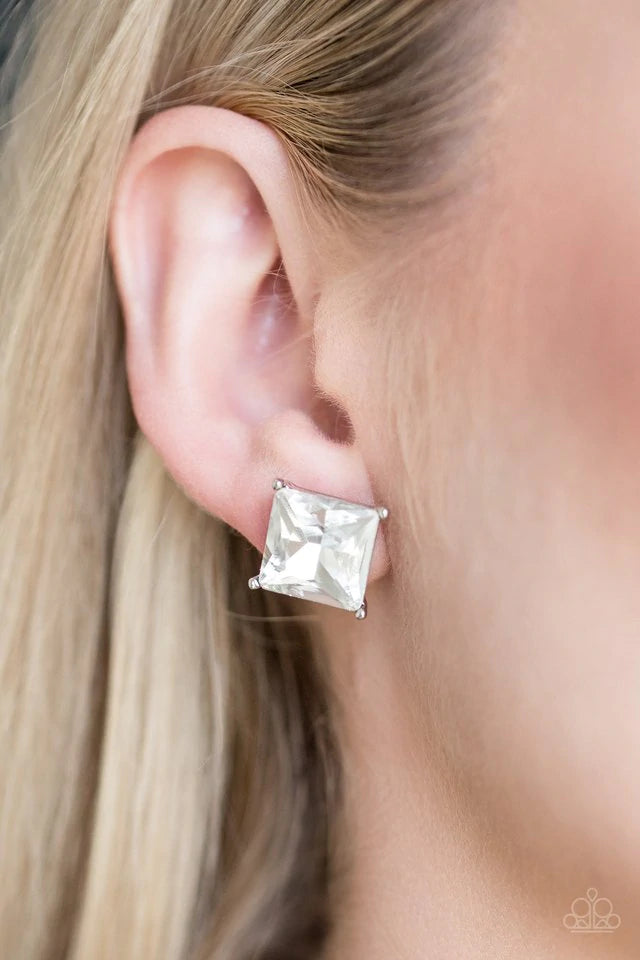 Featuring a timeless princess style cut, a dramatic white gem is pressed into a sleek silver frame for a timeless look. Earring attaches to a standard post fitting.