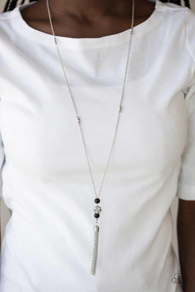 Infused with faceted silver beads, two shiny black beads flank a silver bead encrusted in glittery white rhinestones for a regal look. Features an adjustable clasp closure.