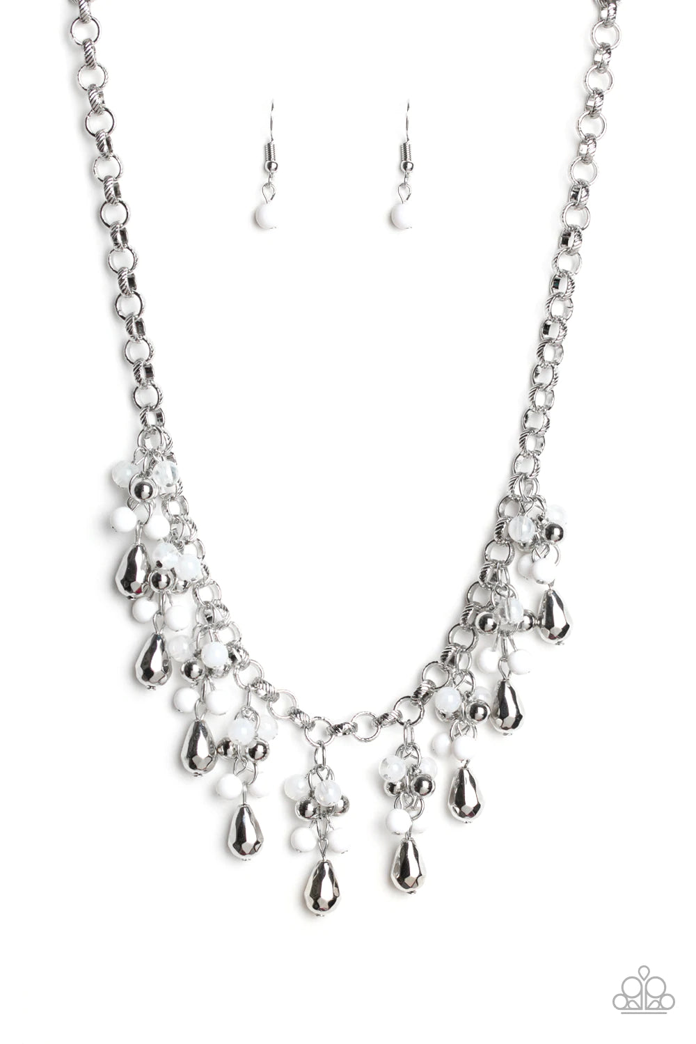 A collection of polished white, shiny silver, opaque beads, and faceted silver teardrops trickle from the bottom of a bold silver chain, creating a courageously clustered fringe below the collar. Features an adjustable clasp closure.