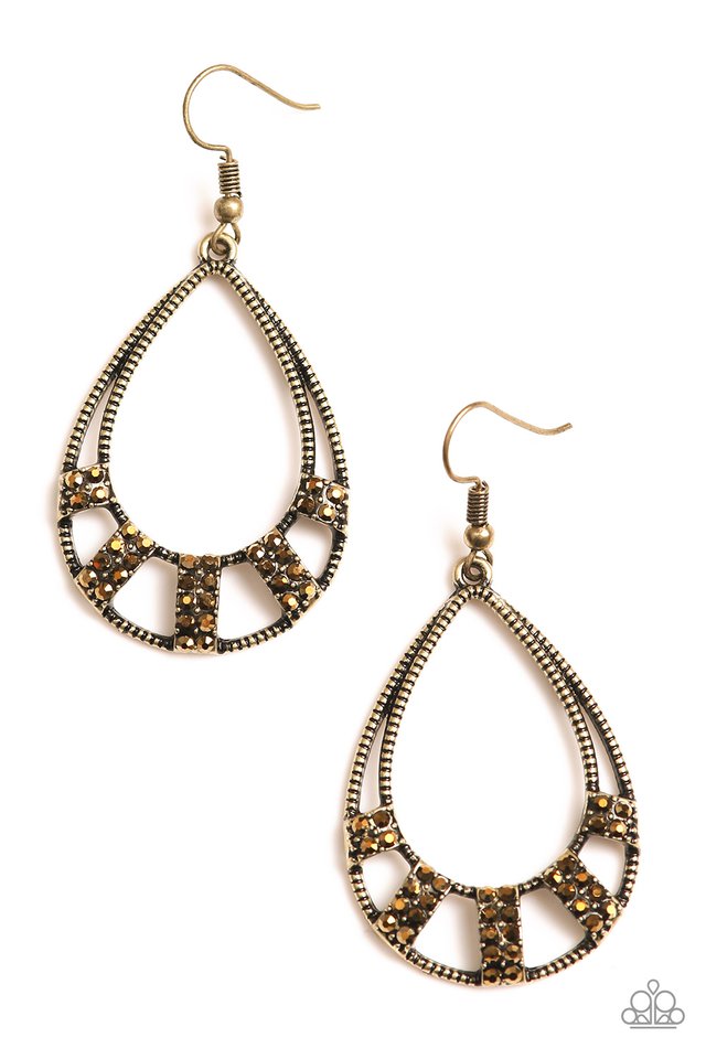 Sections of aurum rhinestone encrusted frames adorn the bottom of an ornate brass teardrop, creating a refined lure. Earring attaches to a standard fishhook fitting.